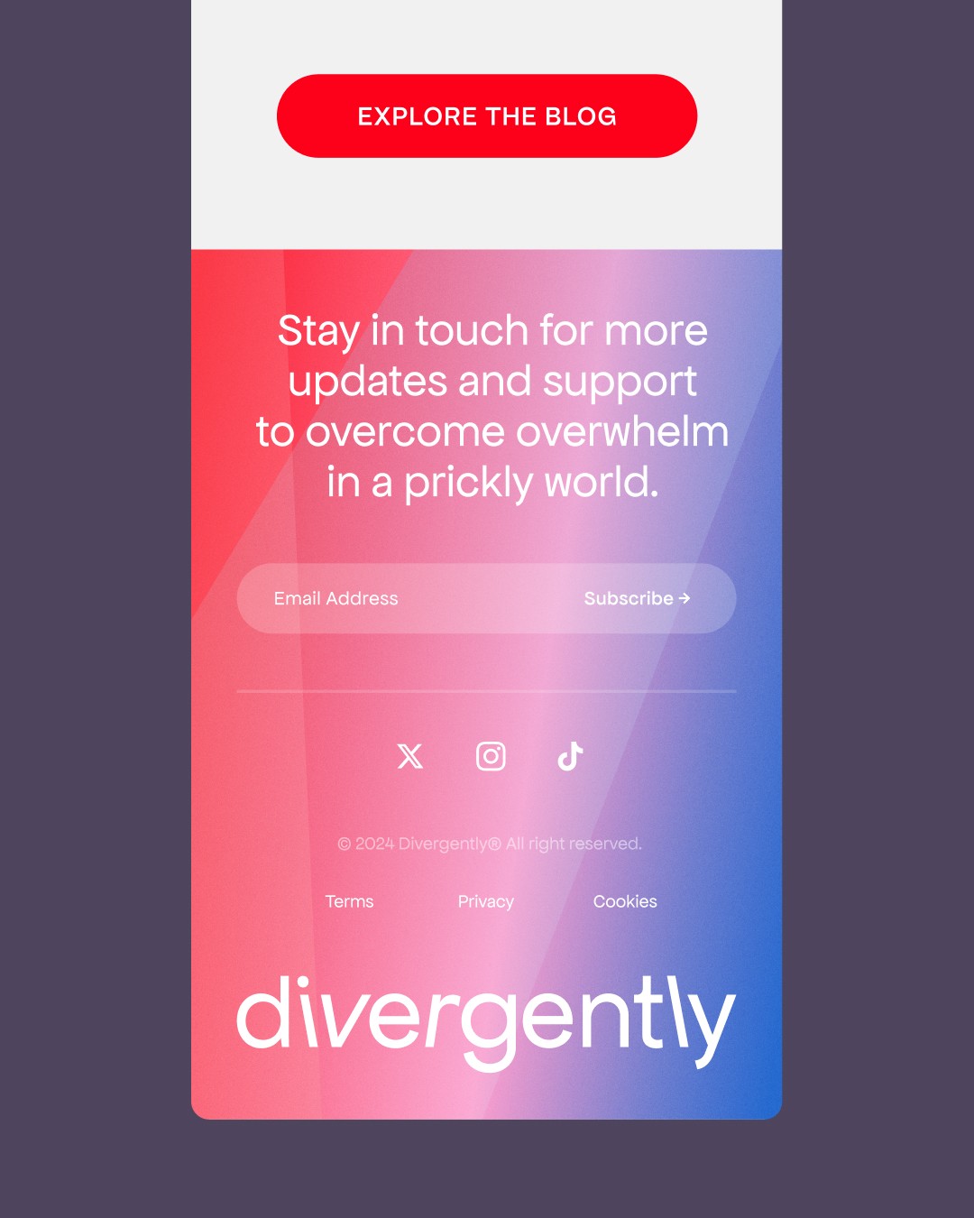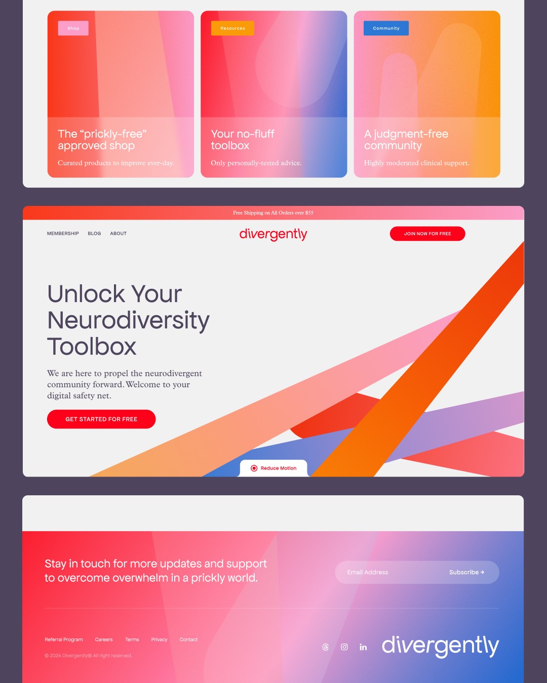 Catering to neurodiverse consumers guided the brand identity. An approachable sans-serif logotype with subtly off-kilter lettering adds a distinct, friendly character. Research shows neurodivergent users prefer high-contrast yet less harsh tones, so a dark plum paired with soft off-white improves readability and reduces fatigue. Bright gradients add an uplifting feel, enhance contrast, and signal the brand’s positive, narrative-shifting mission.