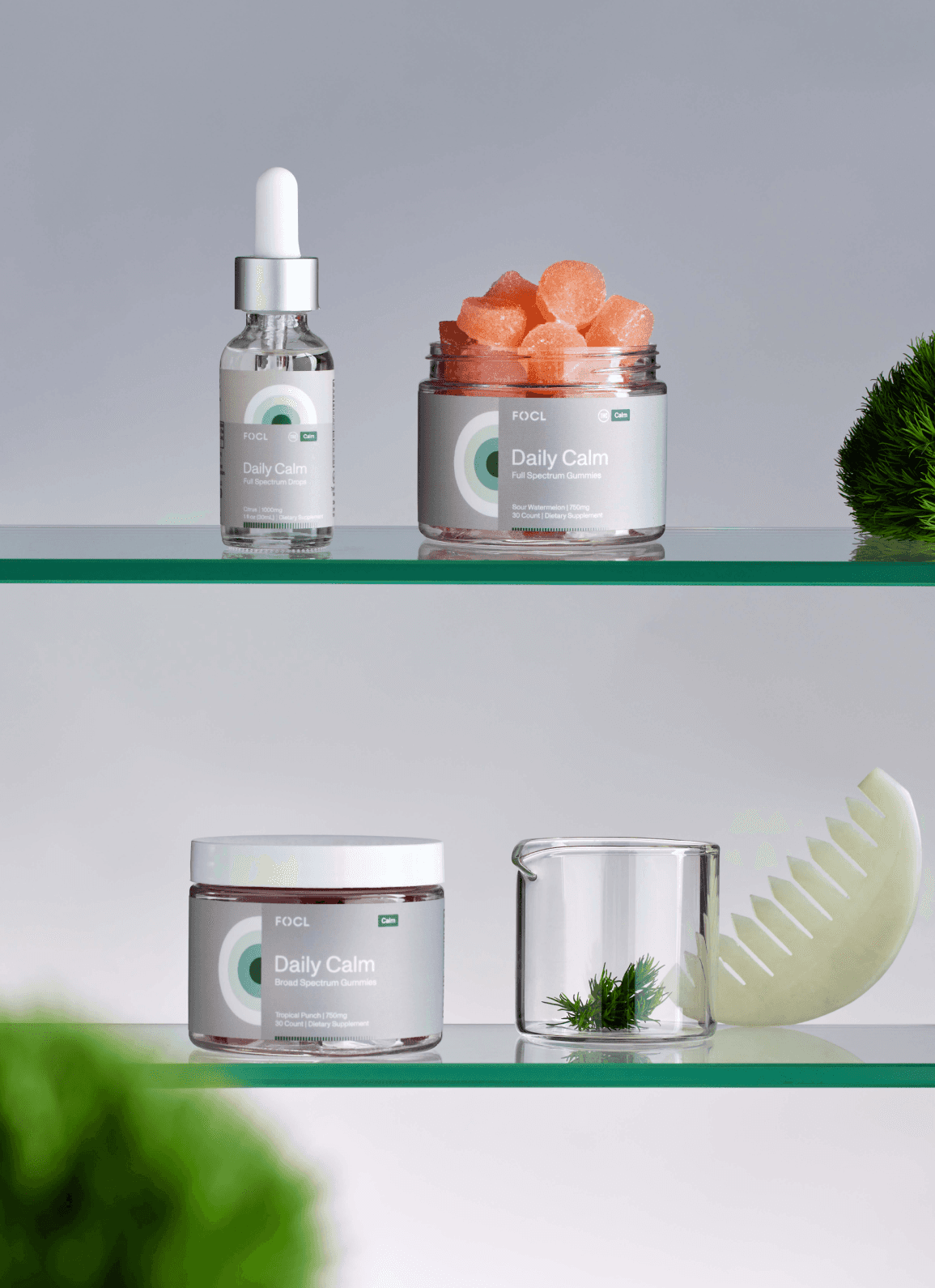 The most important digital touch point for FOCL was a refreshed web presence. The new system of organizing products by “state” appears clear and prominent, guiding first time visitors and veterans alike. The website strikes a balance between feeling fresh and scientific.