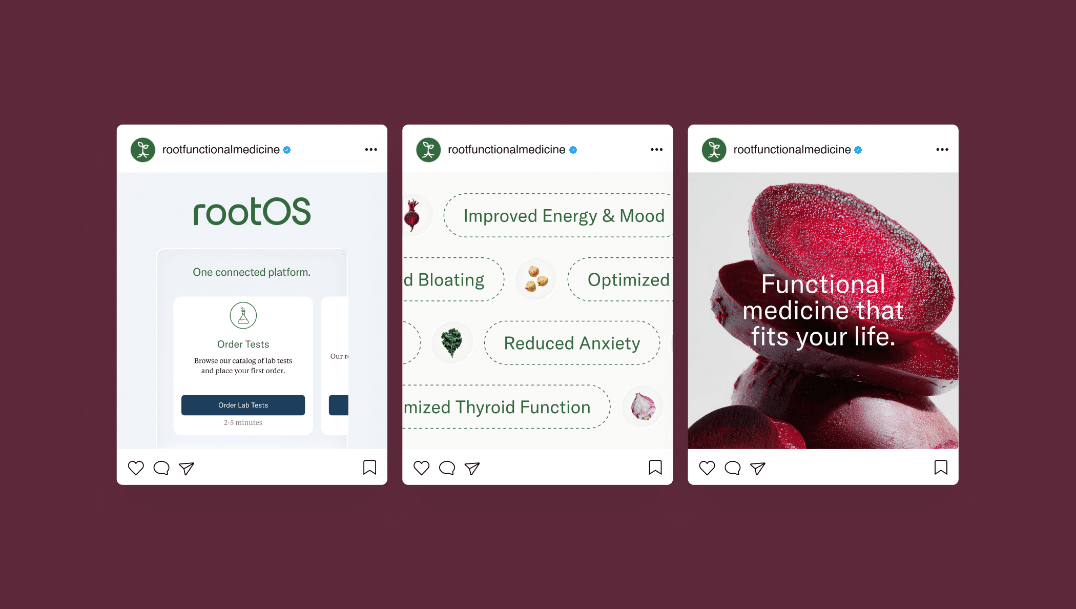 As the functional medicine partner helping teams get and stay well, we developed a new identity for Root’s that reflects its outcomes-driven, tech-forward approach while preserving the warmth and empathy that define its care. The rebrand reinforces Root’s dual voice — proactive and scalable when speaking to businesses, and human and approachable when engaging with members. It also underscores Root’s educational mission: to show how treating the root cause of chronic conditions can transform both individual lives and organizational wellbeing.