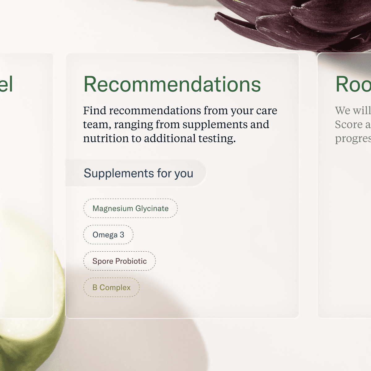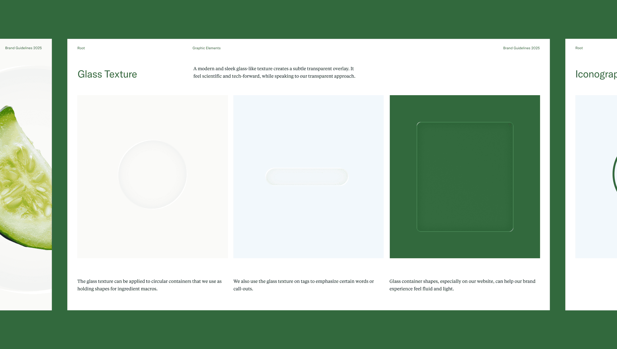The new color palette matures beyond consumer wellness pastels, while anchored in Root’s hero green and supported by foundational neutrals and deeper accent tones that add authority and contrast. Glass textures, and translucent UI elements introduce a sense of clarity and depth, feels scientific and tech-forward, while speaking to Root's transparent approach.