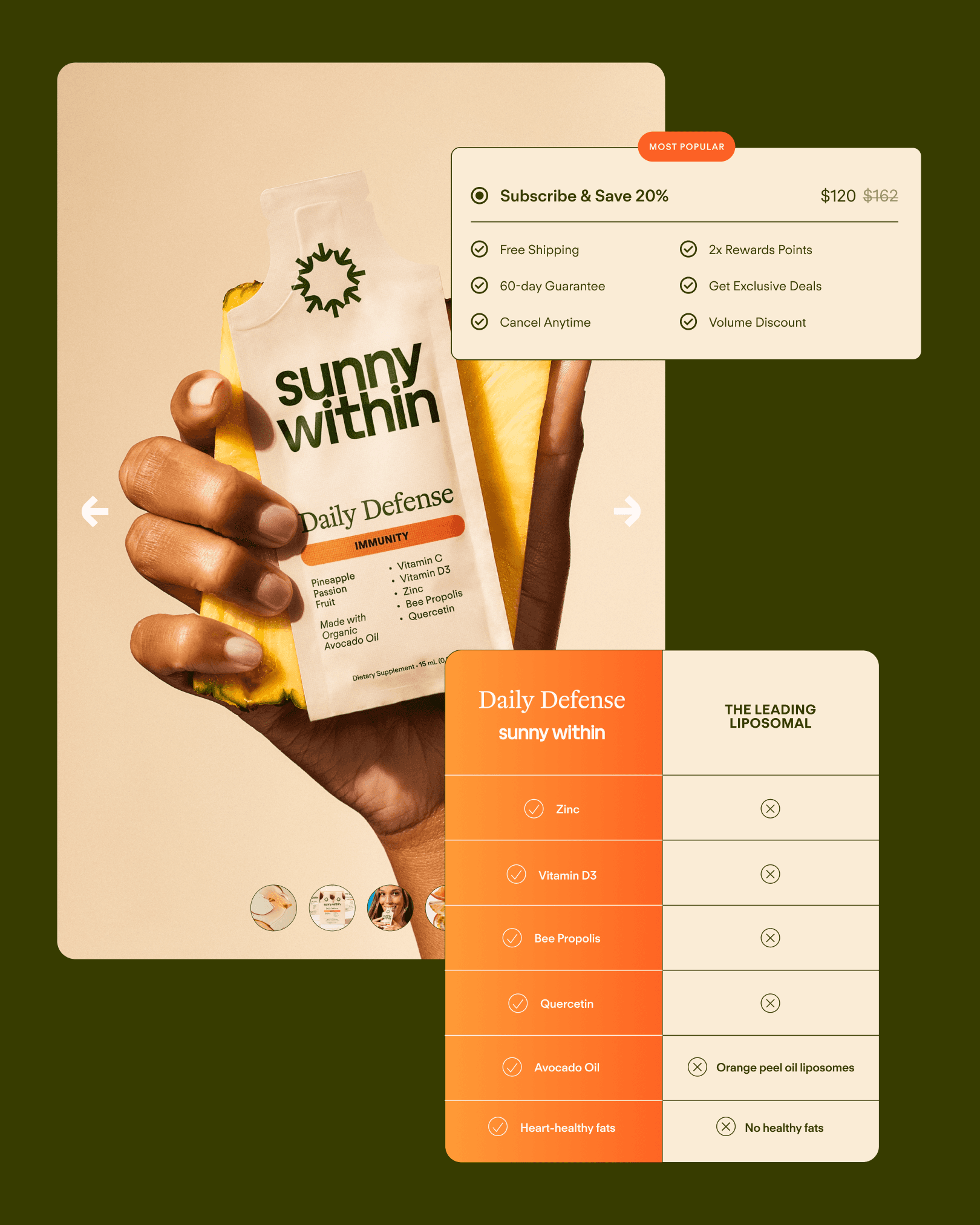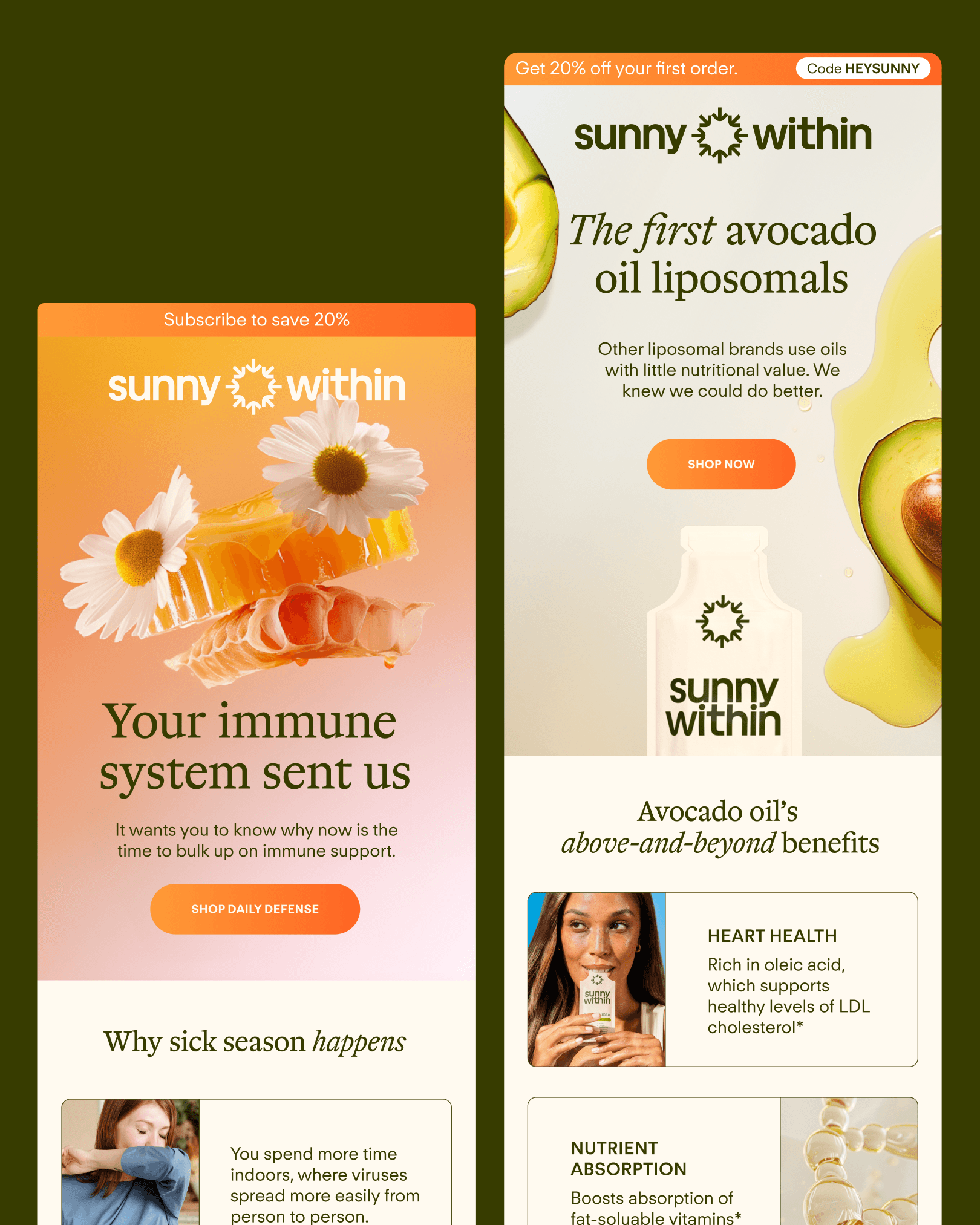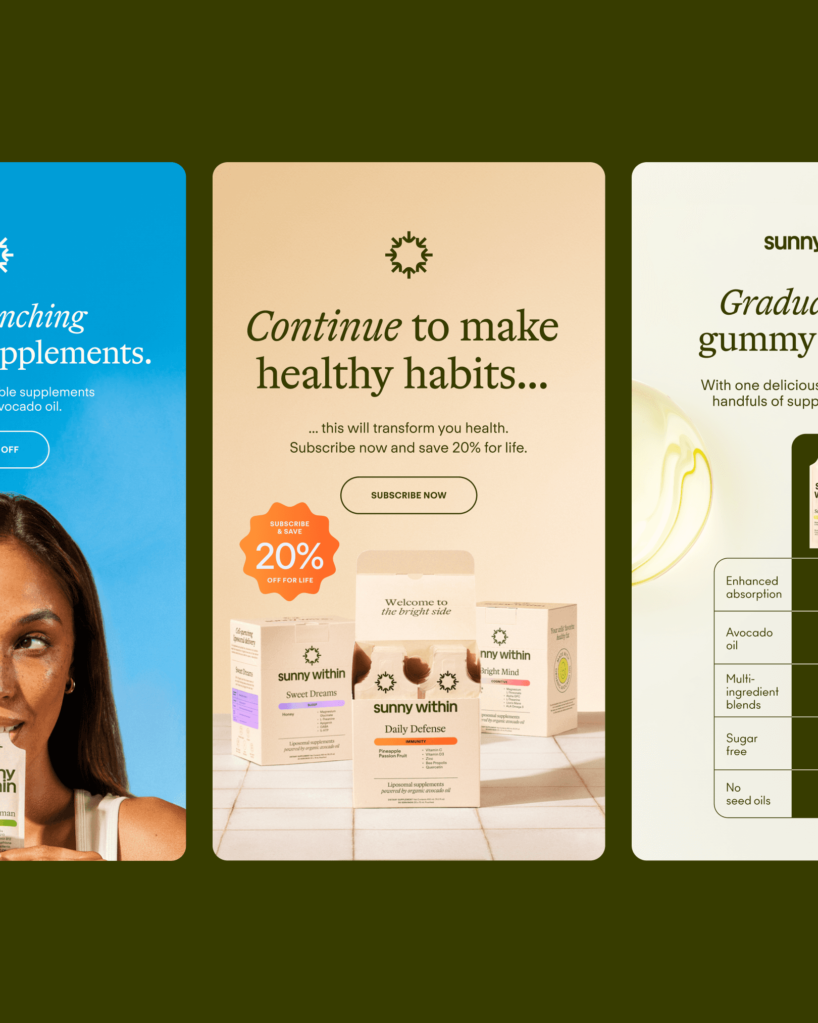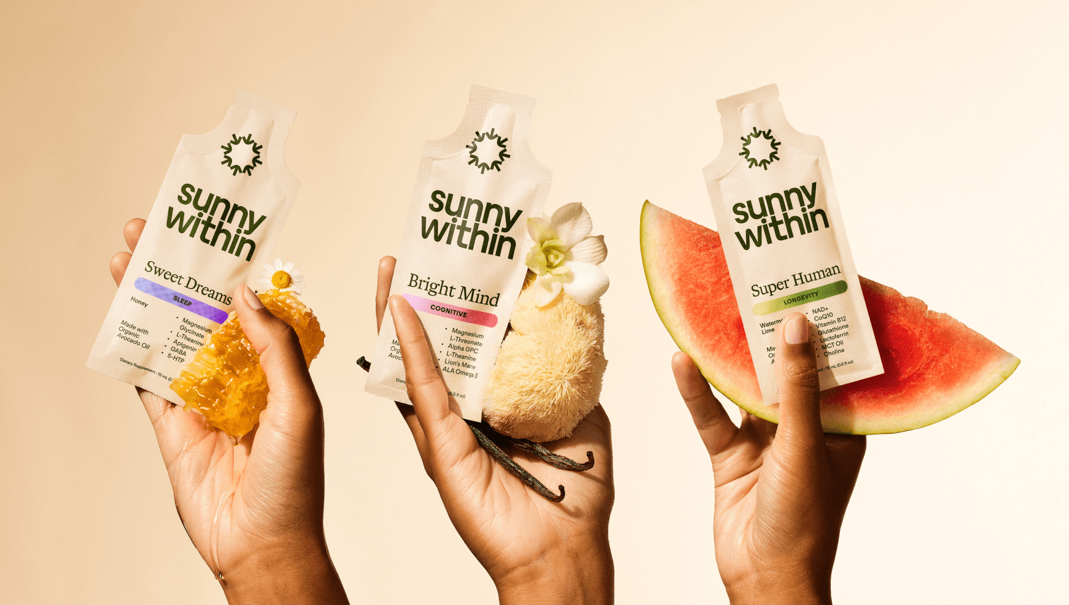 Sunny Within makes supremely absorbable, organic supplements that deliver nature’s most powerful nutrients. The visuals for ingredients needed to introduce trust and authority while not loosing warmth and delightfulness. Both the ingredients and any texture visuals needed to feel clean, powerful, and delicious — like nature intended.