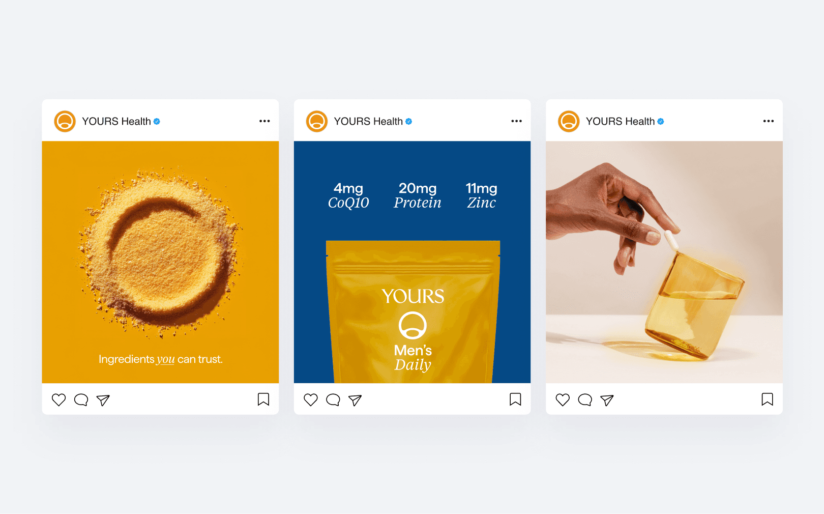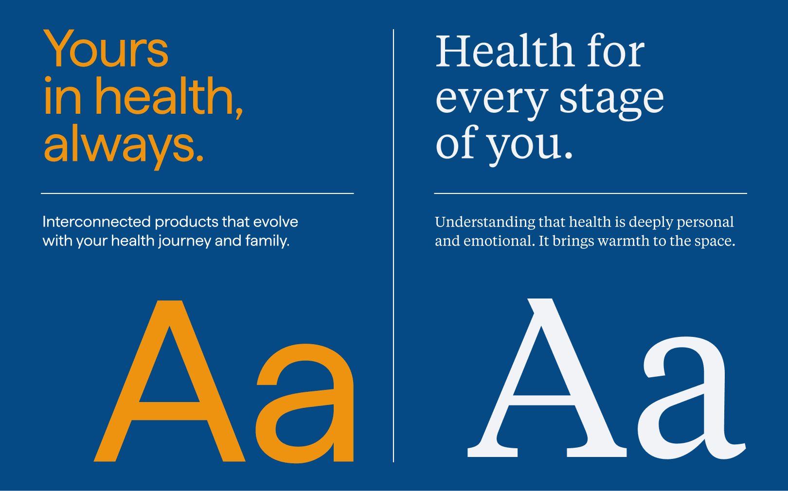 Warm, muted tones signal maturity, trust, and long-term wellness rather than trend-driven vitality. A deep, confident blue anchors the brand in credibility and clinical rigor, while a rich orange introduces warmth and optimism. Supporting neutrals and secondary hues allow the system to scale across new products without diluting brand recognition.